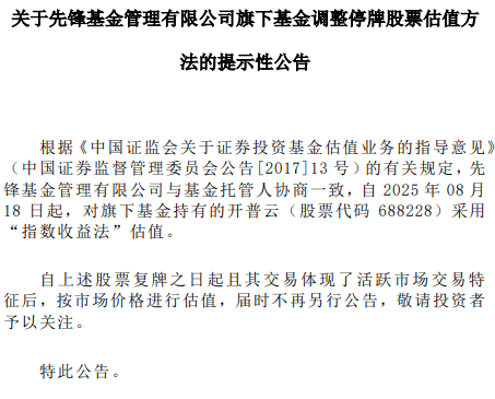 公告称,先锋基金管理有限公司与基金托管人协商一致,自2025年8月18日起,对旗下基金持有的开普云(股票代码 688228)采用“指数收益法”估值。