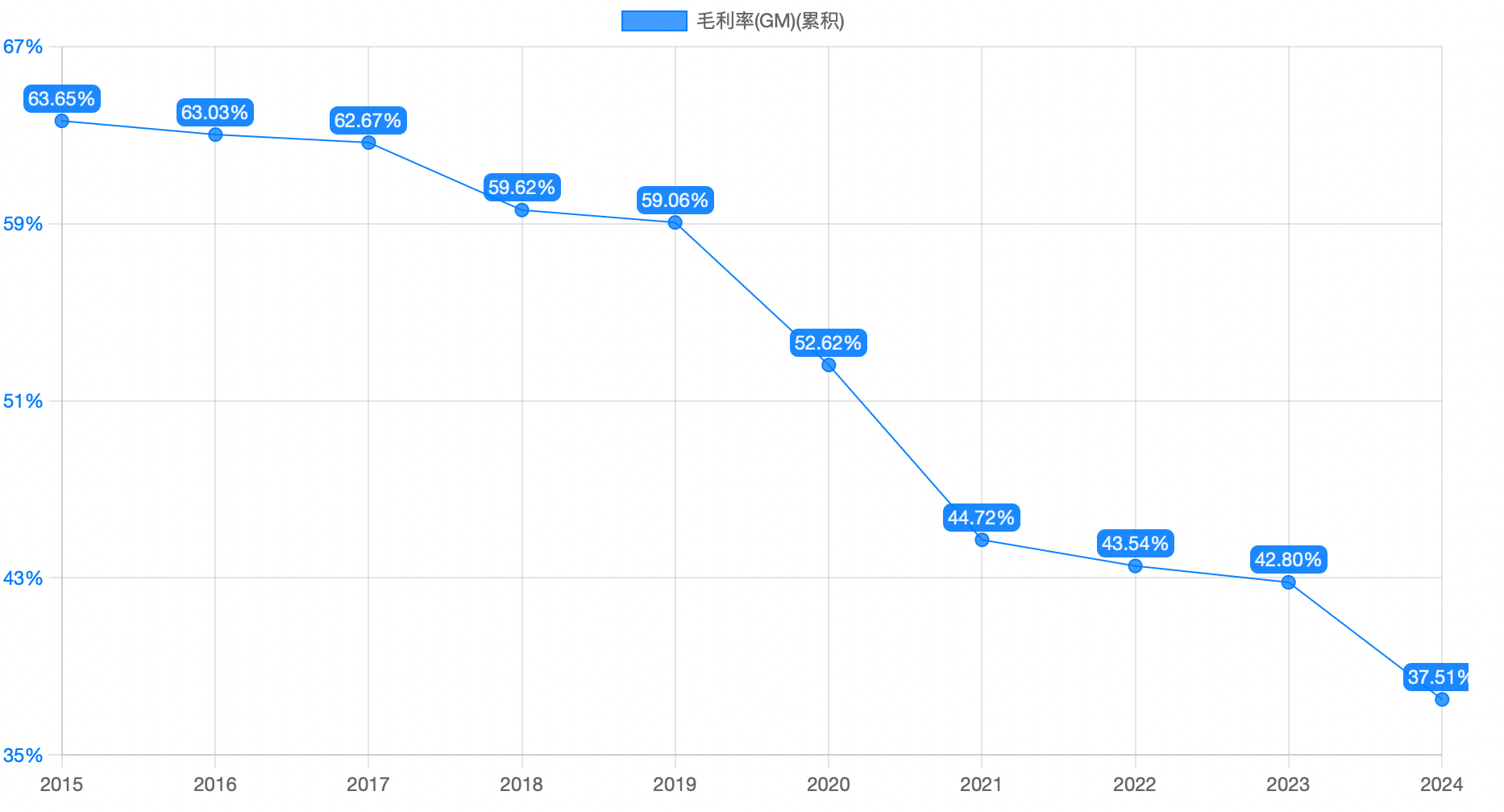 值得一提的是,如果将时间线拉长,公司毛利率水平已经连续十年下滑,2015年该值为63.65%,对比之下如今已接近腰斩。