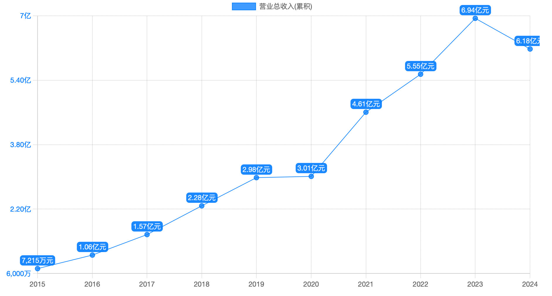 2024年,公司营收、净利出现同步下滑。其中,营业收入由2023年的6.94亿元下滑至6.18亿元,同比下滑10.95%;同期,归母净利润由0.41亿元下滑至0.21亿元,出现腰斩。