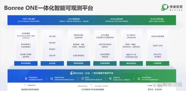 博睿数据核心产品Bonree ONE,是国内首个真正实现智能运维的一体化智能可观测性平台。通过博睿数据领先的大数据采集和智能分析能力,具备全球竞争力的产品特性,真正实现全栈、全链路、全场景的智能可观测,故障根因定位和决策支持,显著提升IT运维的能力和效率,减少平均故障恢复时间MTTR,提升业务连续性,保障敏捷开发,支持智能运营,为企业数字化业务保驾护航。