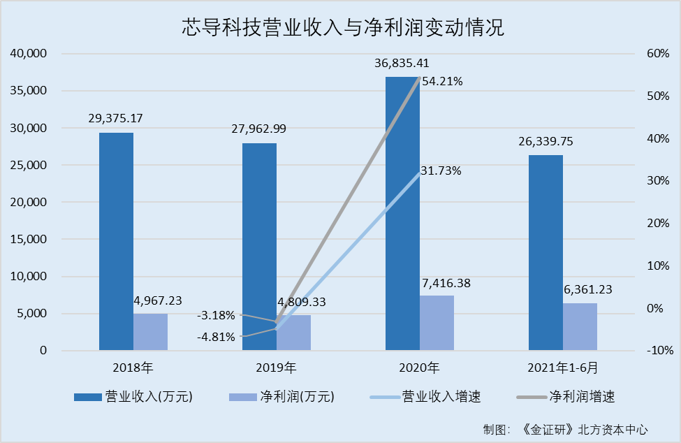 根据《金证研》北方资本中心研究,2019-2020年,芯导科技的营业收入增速分别为-4.81%、31.73%,净利润增速分别为-3.18%、54.21%。