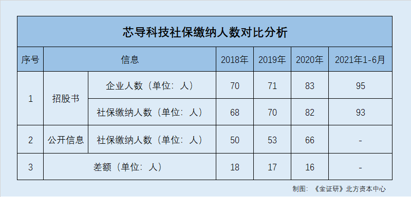 根据《金证研》北方资本中心研究,2018-2020年,芯导科技招股书披露的社保缴纳人数,比其市场监督管理局年报披露的社保缴纳人数分别多18人、17人、16人。