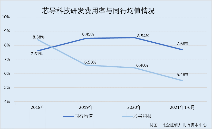 据招股书,2018-2020年及2021年-6月,芯导科技的研发费用率分别为8.38%、6.58%、6.4%、5.48%。同期,同行业可比上市公司韦尔股份、力芯微、芯朋微、新洁能、斯达半岛研发费用率均值分别为7.61%、8.49%、8.54%、7.68%。