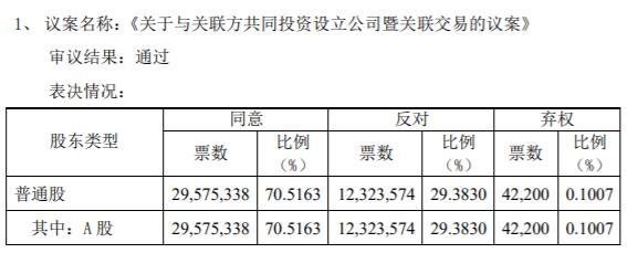 根据表决结果,《关于与关联方共同投资设立公司暨关联交易的议案》获得半数以上表决通过,同意29,575,338股,占比70.52%;反对12,323,574股,占比29.38%,;弃权42,200股,占比0.1%。其中反对票均为5%以下股东所投。