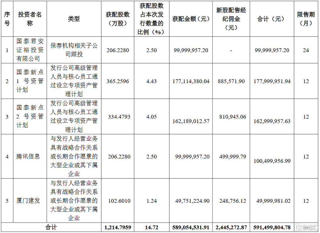 格隆汇11月9日丨新点软件(688232.SH)披露首次公开发行股票并在科创板上市网下初步配售结果及网上中签结果,其中,战略配售结果如下:
