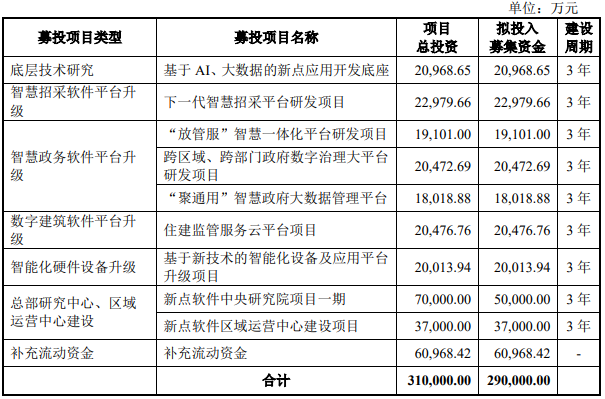 此前披露的招股书显示,新点软件原拟募资29亿元,拟分别用于“底层技术研究”、“智慧招采软件平台升级”、“智慧政务软件平台升级”、“数字建筑软件平台升级”、“智能化硬件设备升级”、“总部研究中心、区域运营中心建设”、“补充流动资金”。
