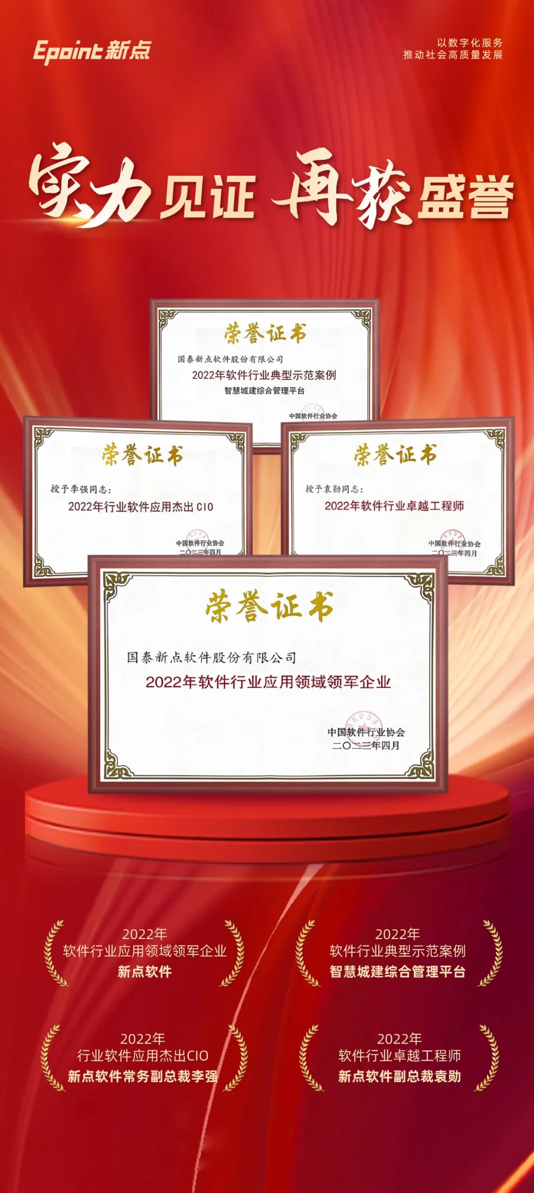 凭借优秀的产品和数字化整体解决方案、持续突破的创新技术和突出的社会贡献,新点软件斩获「2022年软件行业应用领域领军企业」殊荣,常务副总裁李强、副总裁袁勋分别荣获「2022年行业软件应用杰出CIO」、「2022年软件行业卓越工程师」称号,智慧城建综合管理平台入选「2022年软件行业典型示范案例」。深厚的创新能力展现了硬核实力,受到了业界广泛好评。