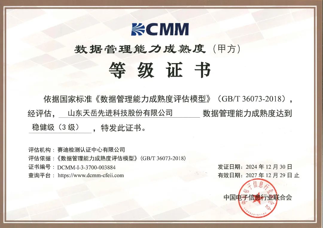 在数字化浪潮蓬勃发展的今天,数据已成为企业发展的关键驱动力。近日,天岳先进获得由赛迪检测认证中心颁发的“数据管理能力成熟度三级证书”,标志公司在数据管理领域具备了稳健而先进的能力。
