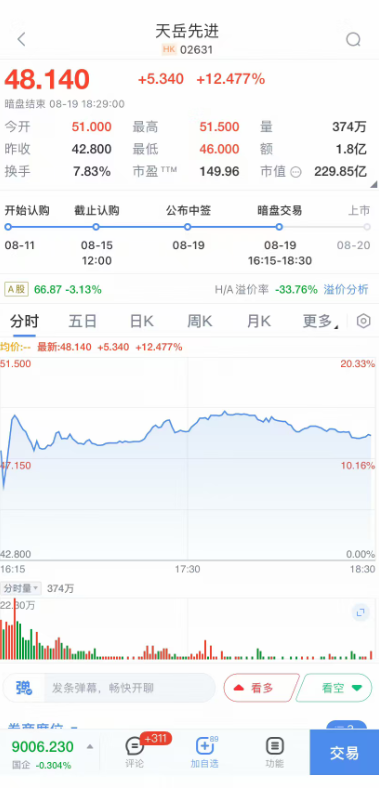 8月19日消息,天岳先进暗盘交易涨12.48%,报48.14港元。天岳先进H股发售价定为42.8港元/股,每手100股,不计手续费,一手赚534港元。天岳先进于8月20日(周三)在港交所挂牌上市。