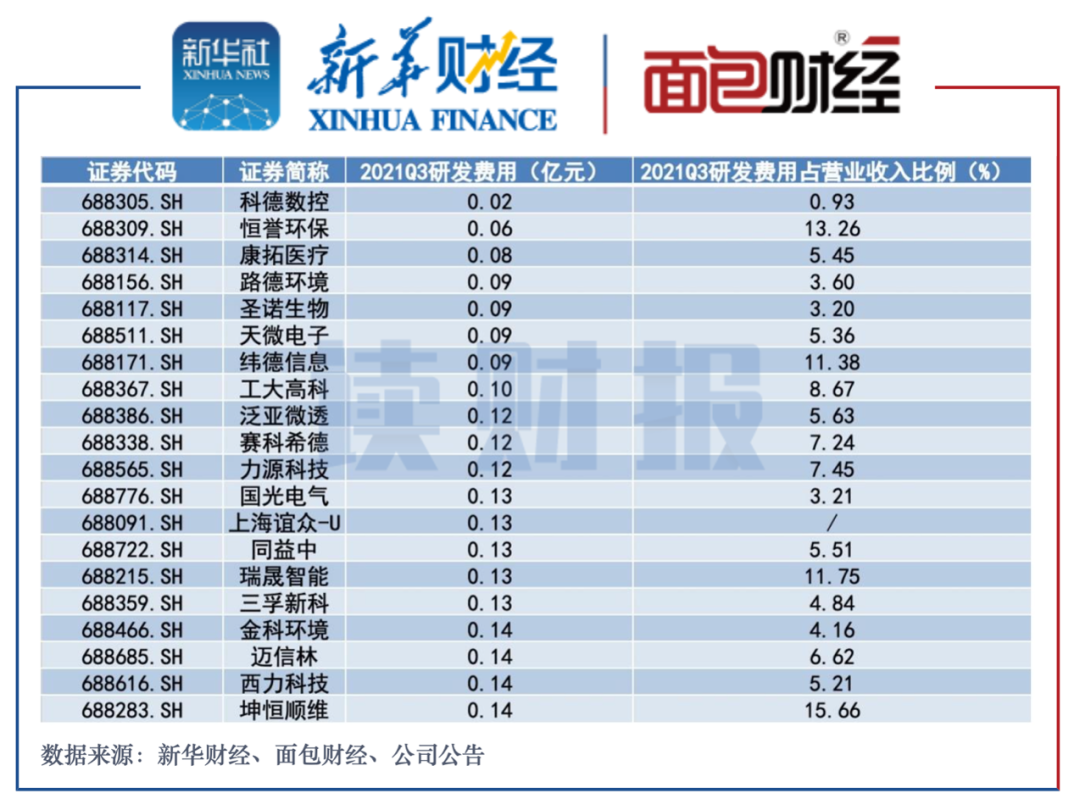 尽管大多数科创板公司持续增加研发投入,但仍有部分公司“含科量”不足。由于科创板公司2021年年报尚未披露完全,因此选用2021年三季度研发费用数据。