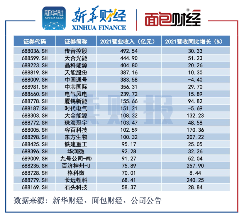 从单个公司来看,传音控股2021年营业收入位于科创板公司首位,达492.54亿元;其次为天合光能,营业收入达444.90亿元。晶科能源紧随其后,营业收入达404.8亿元。
