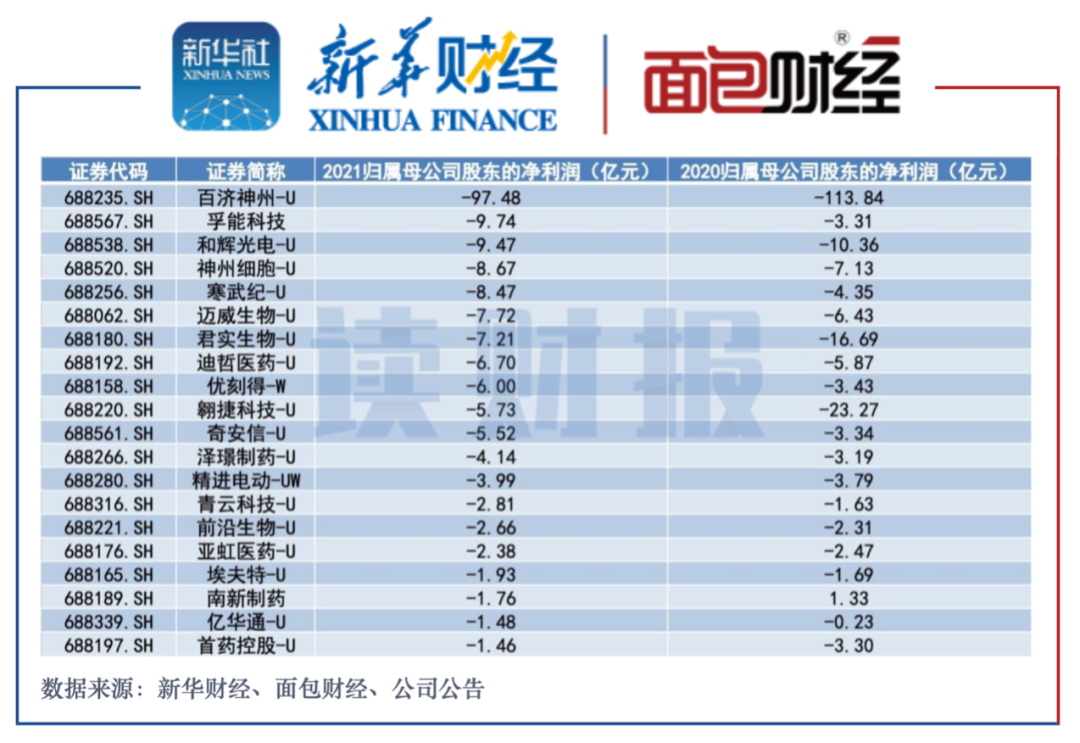 尽管大部分科创板公司业绩表现都出现盈利,仍有少部分公司出现亏损现象。数据显示,2021年科创板公司共有36家出现亏损。在2021年净利润亏损额排名前20的公司中,19家出现续亏状态,仅有一家由盈转亏。