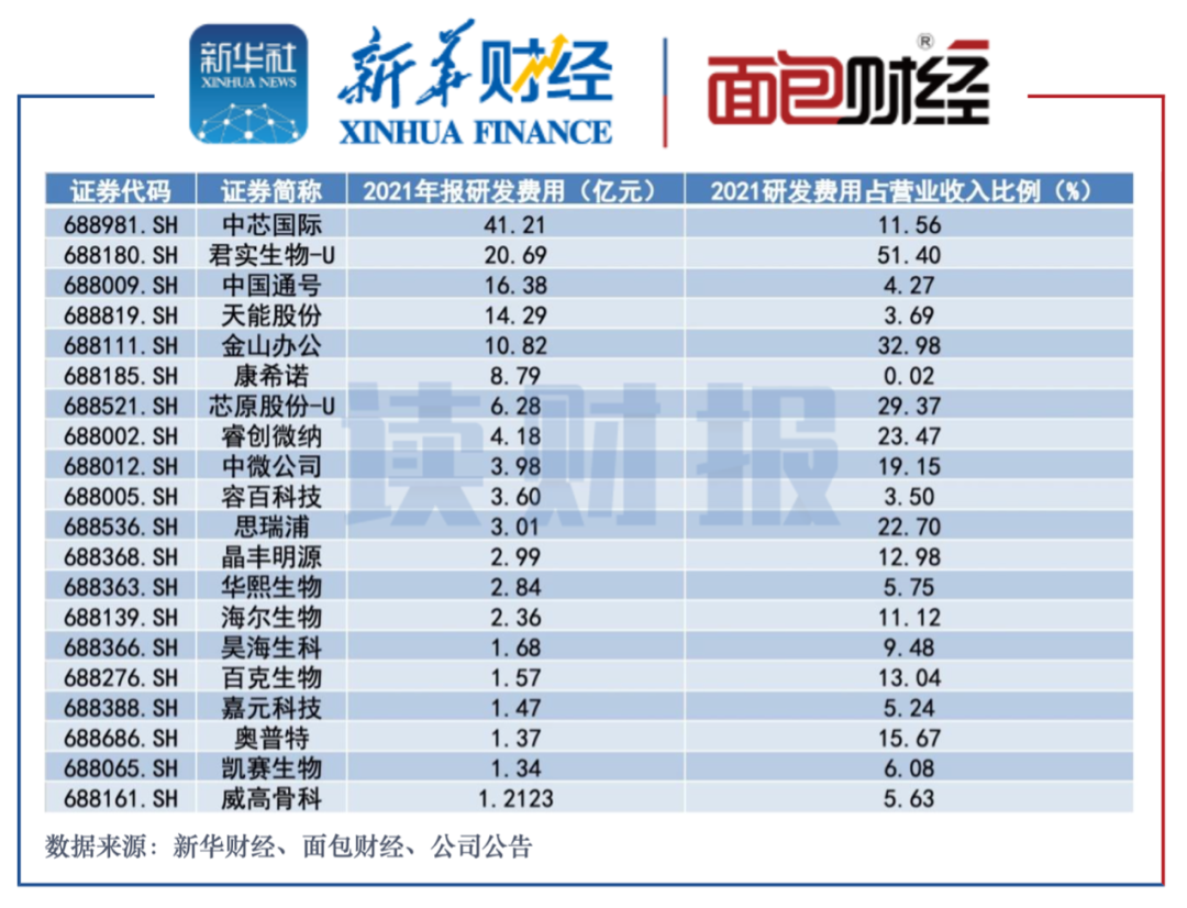 在已披露年报的科创50成分股中,中芯国际2021年的研发费用为41.21亿元,位居首位,也是唯一一家研发费用超过40亿元的科创板公司。