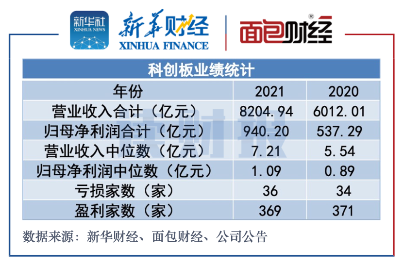 总体来看,2021年,405家科创板公司实现营业收入超8000亿元,同比增长超30%;实现归母净利润为940.2亿元,同比增长超70%,超9成公司实现盈利。
