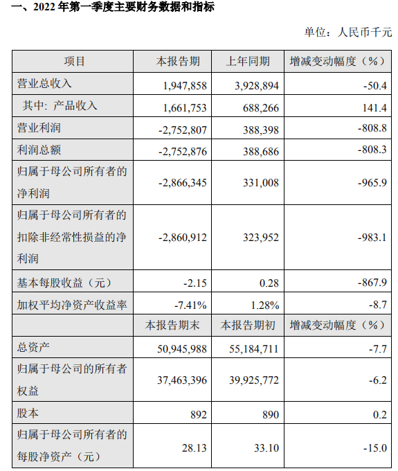 5月5日晚间,百济神州(688235.SH)发布2022年一季报,公司实现营业总收入19.48亿元,同比下降50.4%。其中,产品收入16.62亿元,同比上升141.4%;公司实现归属于母公司所有者的净利润亏损28.66亿元,同比减少965.9%。