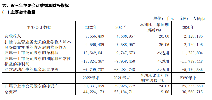 4月25日,百济神州披露的2022年年报显示,报告期内,公司实现营业收入95.7亿元,比上年同期增加26.06%;实现净亏损136.4亿元,比上年同期扩大39.95%。