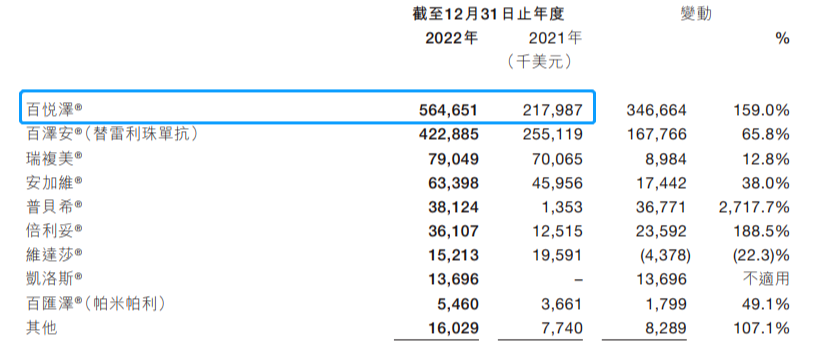 2023 Q1,百悦泽?(泽布替尼)的全球销售额为2.114亿美元,占Q1总销售额的47.2%,同比增长将近一倍,占去年百悦泽?年销售额5.647亿美元的37.44%,预估今年的年销售额可超8亿美元。