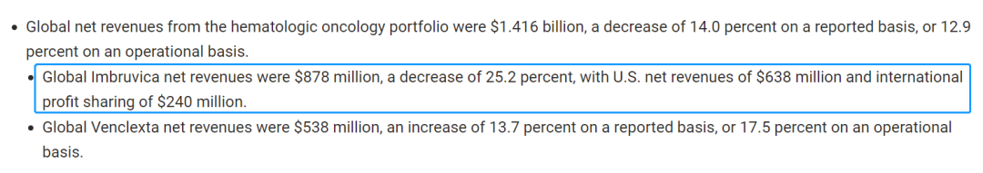 艾伯维/强生的伊布替尼在Q1整体销售额同比下滑25%,为8.78亿美元,阿斯利康的阿卡替尼Q1 销售额为5.32亿美元。