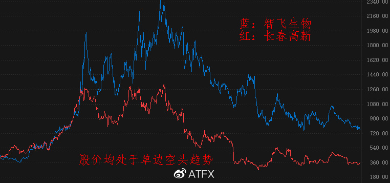生物制药板块排名第二位和第三位的上市公司分别因为智飞生物和长春高新,两者的股价走势与百济神州大为不同。2021年6月份开始,两家上市公司的股价就进入下跌状态,截至目前仍未寻得有效支撑,空头趋势延续。百济神州已经转涨,而智飞生物和长春高新仍处跌势,可见创新药板块的龙头个股具有显著的抗跌属性,值得长期关注。