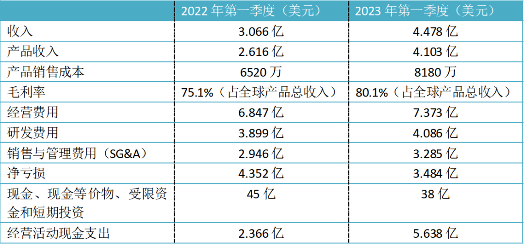 毛利率有所提升,净亏损也有所缩小。2023年第一季度的毛利占全球产品总收入的80.1%;相比较,上一年同期为75.1%。2023年第一季度,净亏损为3.484亿美元,相比较,2022年同期净亏损为4.352亿美元。