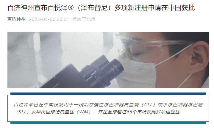 5月6日,百济神州宣布,药监局已批准其布鲁顿氏酪氨酸激酶抑制剂(BTKi)百悦泽?(泽布替尼)相关的四项注册申请,包括两项新增适应症的上市许可申请,具体为新诊断的成人慢性淋巴细胞白血病(CLL)或小淋巴细胞淋巴瘤(SLL)患者和新诊断的成人华氏巨球蛋白血症(WM)患者,以及两项附条件批准转为常规批准的补充申请。