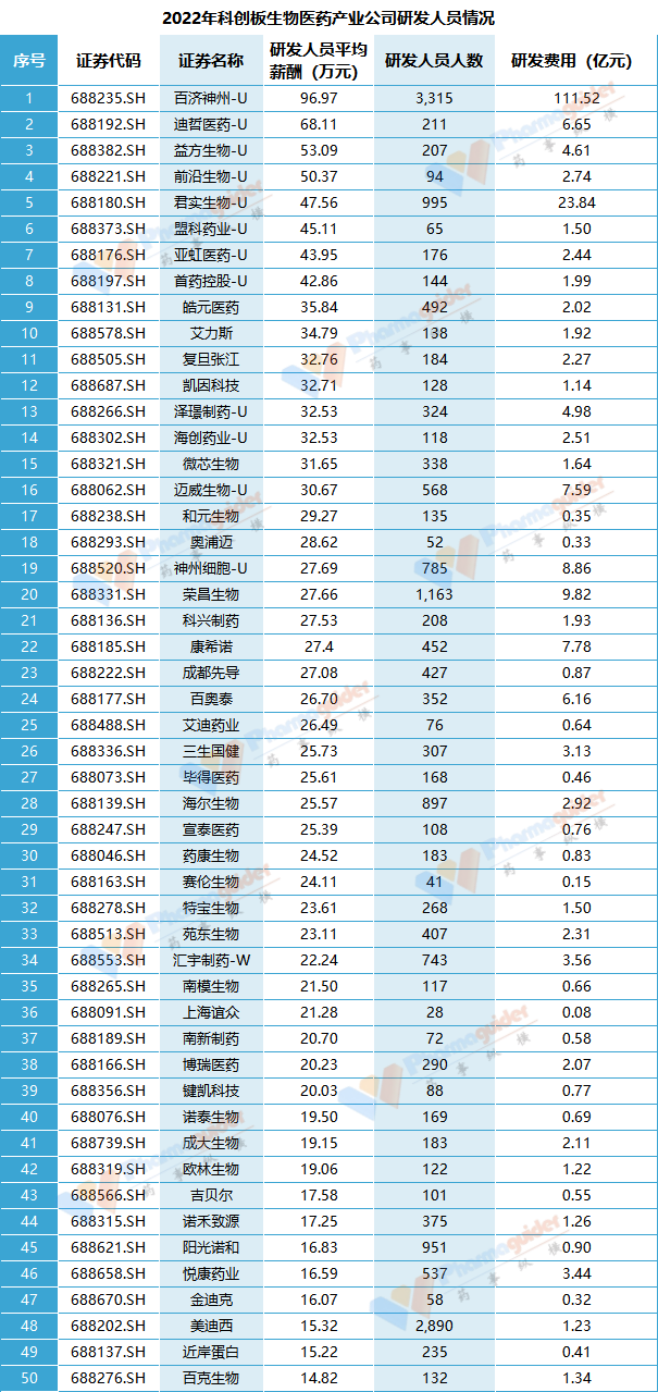 截止到4月30日,A股上市公司年报披露完毕,根据科创板战略新兴产业分类,我们统计了“生物医药产业”2022年科创板药企研发人员平均薪酬情况,其中top50如下: