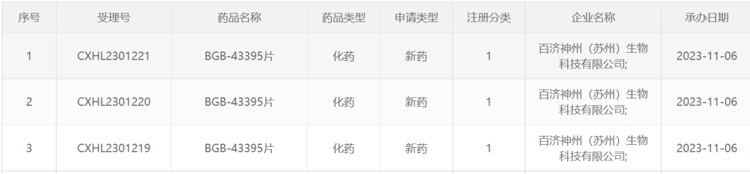 2023年11月6日,百济神州BGB-43395片的临床试验申请获得NMPA受理。