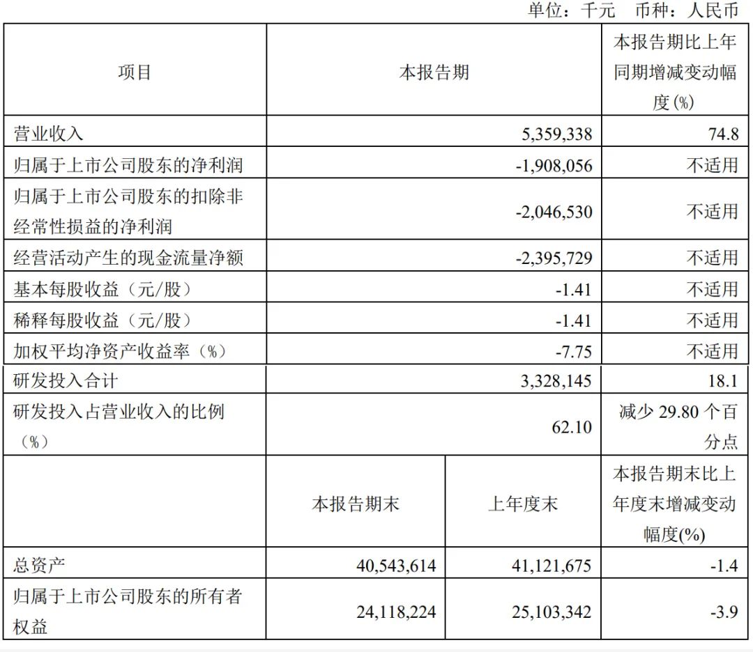 百济神州2024年第一季度营收为53.59亿元,较上年同期增长74.8%。