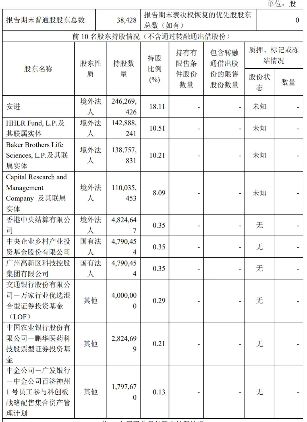 截至2024年3月31日,安进持股为18.11%,高瓴旗下HHLR Fund, L.P.及其联属实体持股为10.51%,Baker Brothers Life Sciences,L.P.及其联属实体持股为10.21%;