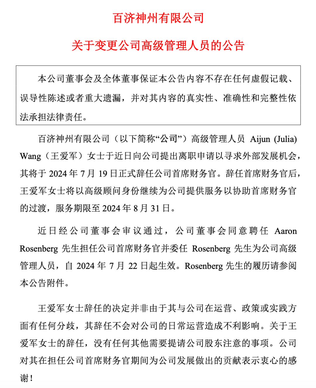 百济神州宣布首席财务官王爱军将辞职并转任高级顾问,但公司迅速任命了新任首席财务官Aaron Rosenberg。