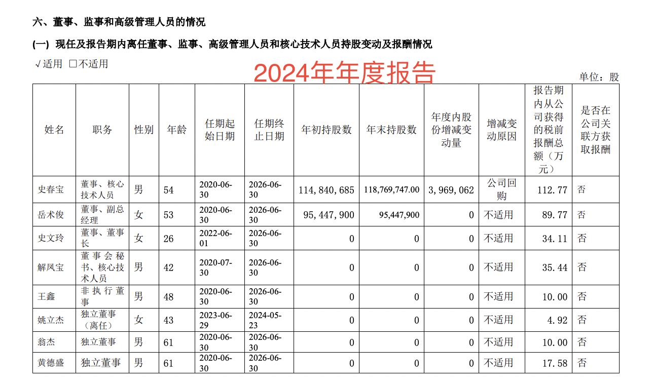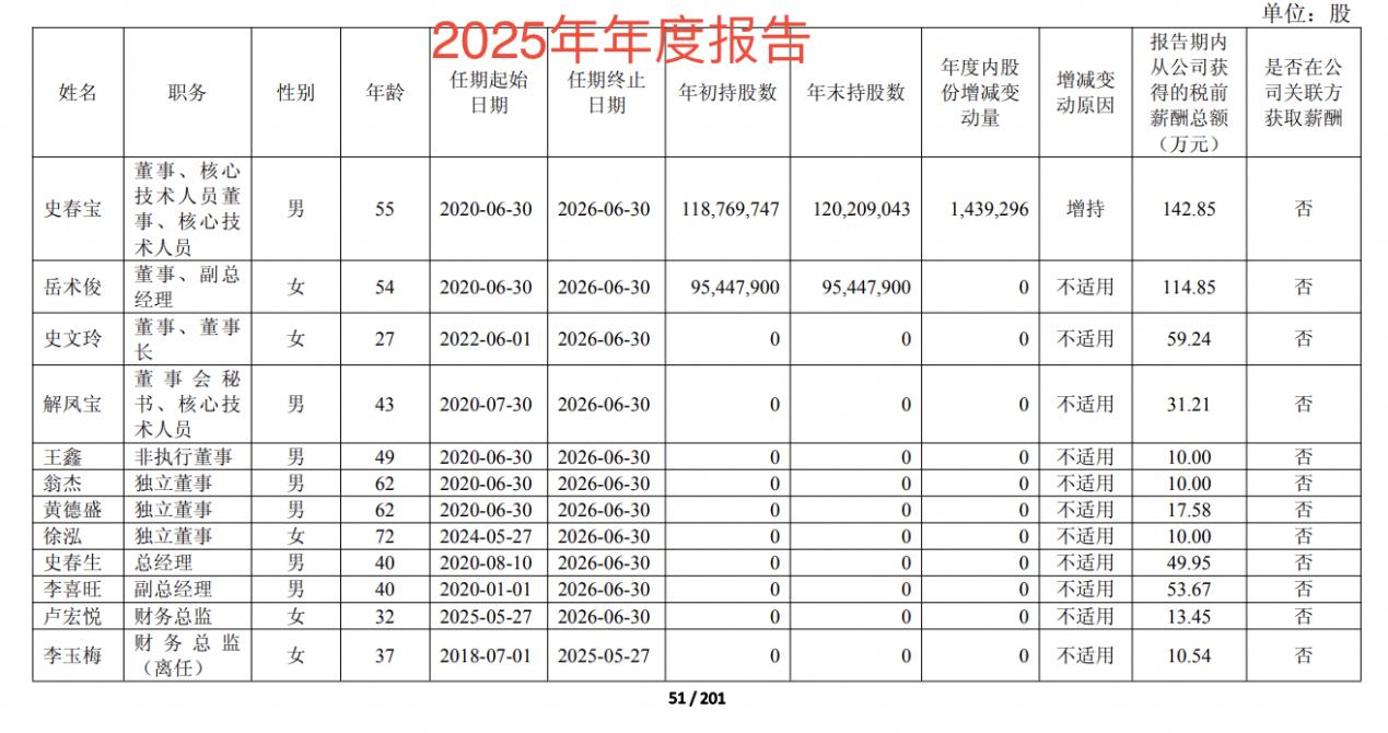 薪酬方面,2025年,史文玲薪酬为59.24万,较上一年增加25.13万元;岳术俊薪酬为114.9万元,较上一年增加25.08万元;史春宝薪酬为142.9万元,较上一年增加30.08万元。