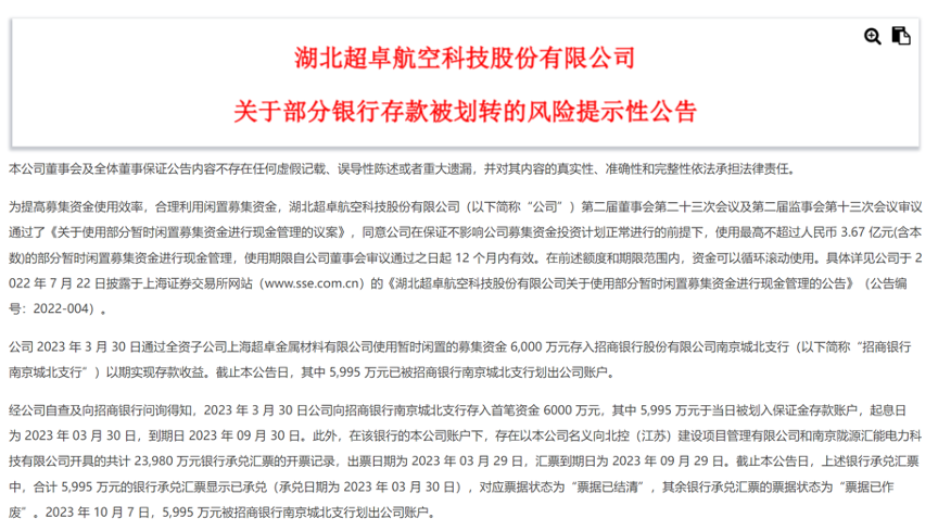 近日,科创板上市公司超卓航科(SH 688237)近6000万银行存款莫名被被划转引发外界热议。