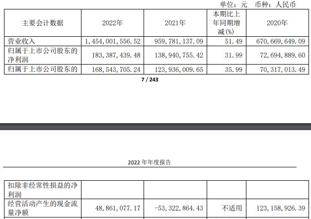 航宇科技2022年年度报告显示,2022年,航宇科技实现营业收入14.54亿元,同比增长51.49%;归属于上市公司股东的净利润1.83亿元,同比增长31.99%;归属于上市公司股东的扣除非经常性损益的净利润1.69亿元,同比增长35.99%;经营活动产生的现金流量净额4886.11万元,2021年同期该数据为-5332.29万元。