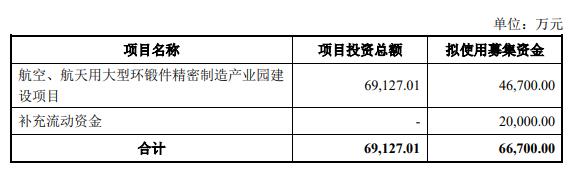 航宇科技上市的募集资金总额为4.02亿元,募集资金净额为3.49亿元,较原拟募资净额少3.51亿元。航宇科技此前披露的招股书显示,公司拟募资净额为7亿元,拟分别用于“航空发动机、燃气轮机用特种合金环轧锻件精密制造产业园建设项目”、“补充流动资金”。
