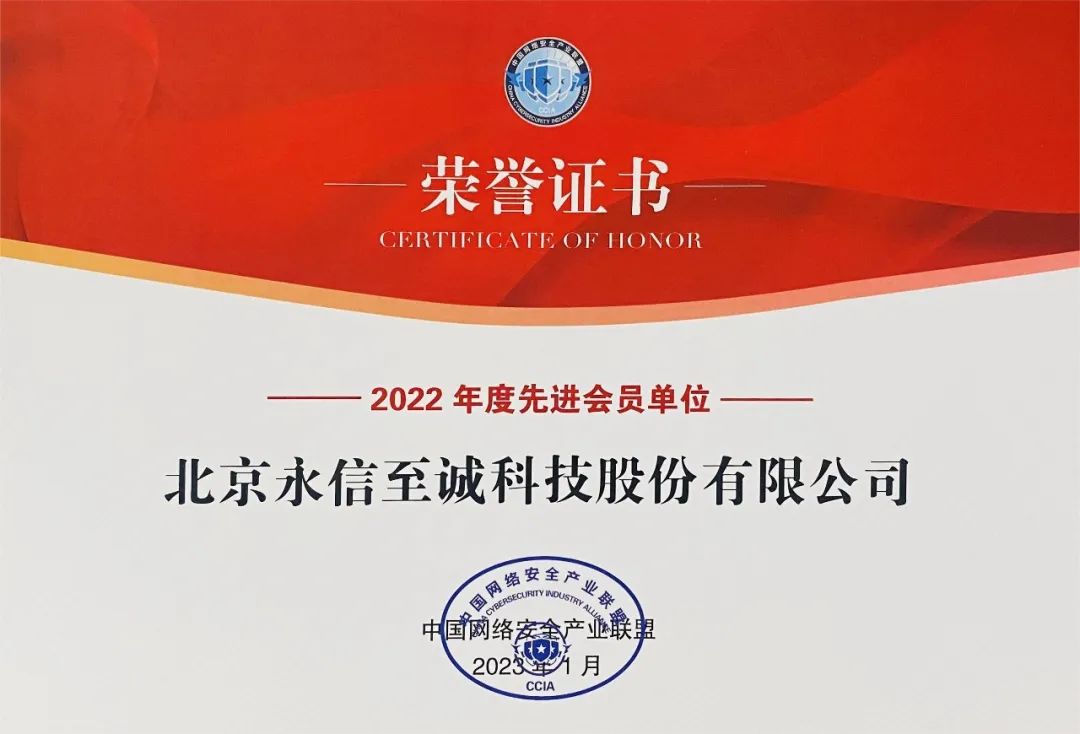 近日,中国网络安全产业联盟(CCIA)发布“关于2022年度表彰先进的决定”,对在联盟工作中做出积极贡献的会员单位进行表彰,永信至诚当选“2022年度先进会员单位”,这也是永信至诚凭借在联盟工作中的突出贡献,连续五年获得认可。