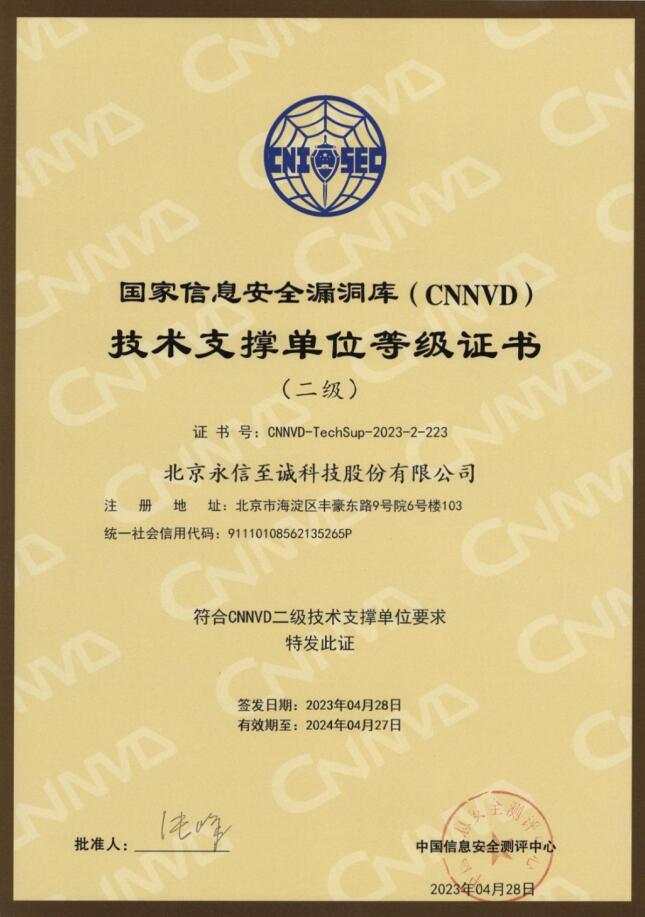 中国信息安全测评中心公布2023年度国家信息安全漏洞库技术支撑单位名单,永信至诚凭借专业的安全测试评估能力、攻防能力以及应急响应处置能力荣获国家信息安全漏洞库技术支撑单位二级证书。这也是永信至诚自2015年以来,连续九年获国家信息安全漏洞库认可。