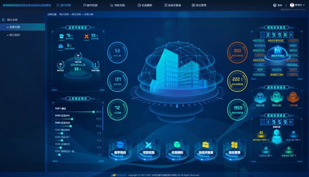 针对上述痛点,永信至诚立足《高等院校网络空间安全专业实战化人才培养系列教材》(14本),打造定制化的国家级网络靶场平台,将教材中每一行理论知识精准映射至实操环境,成功构建起一套完整且可落地的育人闭环。
