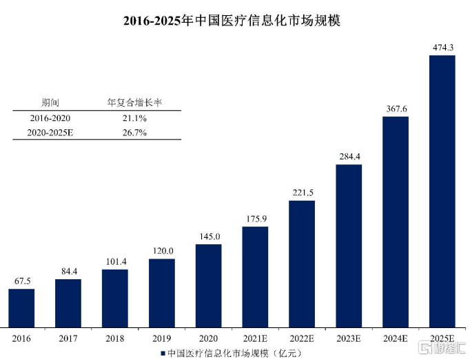 而目前中国的医疗信息化市场正处于快速发展阶段,根据Frost&Sullivan《中国医疗信息化市场研究报告》,预计中国医疗信息化市场规模2020年-2025年的年复合增长率将达到26.7%。如此高的增长速度意味着医疗信息化赛道未来有高爆发增长的可能,赛道玩家有望享受行业增长红利。