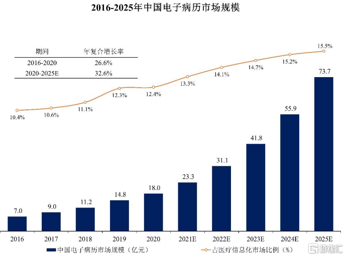 从细分赛道来看,电子病历作为中国医疗信息化改革中的基础部分,市场增长快于整体医疗信息化市场的增长。根据Frost&Sullivan《中国医疗信息化市场研究报告》,其市场规模到2025年预计达73.7亿元,2020-2025年的年复合增长率高达32.6%。