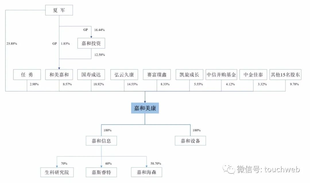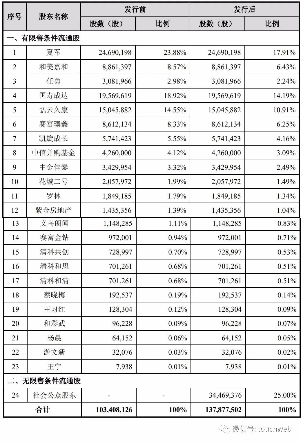 IPO后,夏军持股为17.91%,和美嘉和持股为6.43%,任勇持股为2.24%,国寿成达持股为14.19%,弘云久康持股为10.91%,赛富璞鑫持股为6.25%,凯旋成长持股为4.16%,中信并购基金持股为3.09%,中金佳泰持股为2.49%。