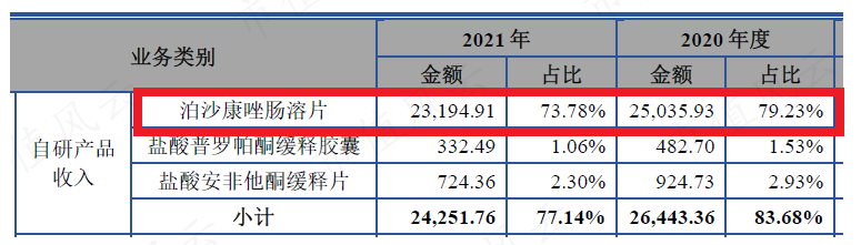 目前,宣泰医药的商业化仿制药比较多,但从收入结构看,其实就是靠一款拳头产品:泊沙康唑肠溶片(以下简称“泊沙康唑”)。2020和2021年,超过70%的营收都是由泊沙康唑这一款产品贡献。