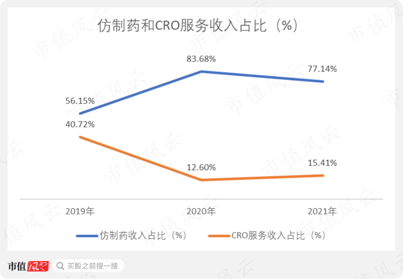 从收入结构看,仿制药占公司营收的比例从2019年的56.15%提升至2021年的77.14%。与之相反,CRO服务收入占比则从40.72%下降至15.41%。