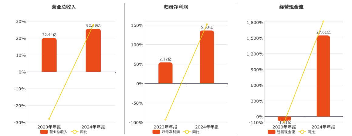 公司营业总收入为92.49亿元,较去年同报告期营业总收入增加20.06亿元,同比较去年同期上涨27.69%。归母净利润为5.33亿元,较去年同报告期归母净利润增加3.21亿元,同比较去年同期上涨151.78%。经营活动现金净流入为27.61亿元,较去年同报告期经营活动现金净流入增加29.22亿元。