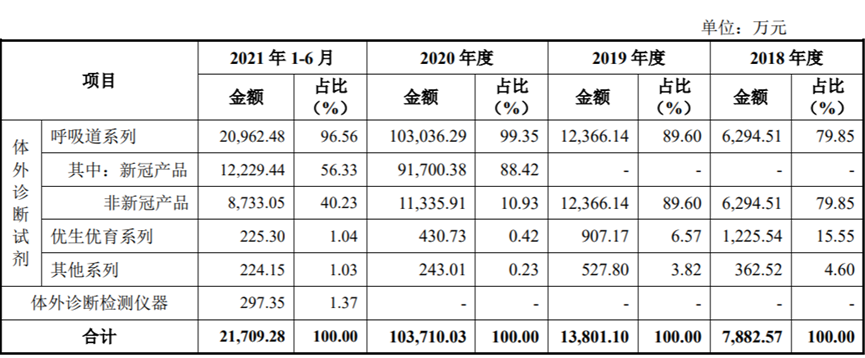 从收入来看,呼吸道系列产品几乎撑起了该公司的营收。报告期内公司呼吸道系列产品收入占主营业务收入比例分别为 79.85%、89.60%、99.35%和96.56%,占比极高,产品类型集中在新冠产品。