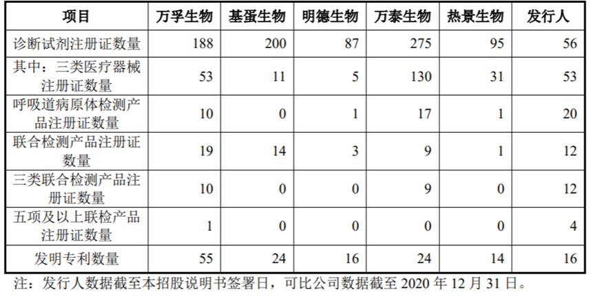 研发端发力不足,造成了英诺特检测试剂注册证总数上不及同行业可比公司,由于注册产品总数少,在发明专利绝对数量上少于万孚生物、基蛋生物和万泰生物。