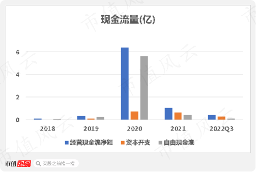 2018-22年前三季度,公司通过经营活动共产生了8.3亿现金流,支出资本开支为1.8亿,最终自由现金流净流入6.5亿,很是宽裕。