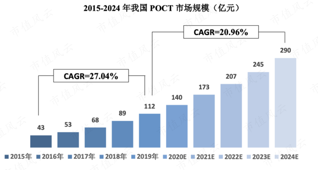 而我国该行业发展现状则是起步晚,整体市场规模较小,还处于发展初期的快速增长阶段。据统计,2019-24年我国POCT行业规模将从112亿元增长至290亿元,年复合增长率将超20%。