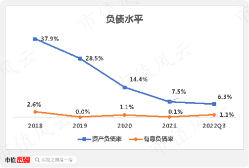 不仅如此,2018年开始公司资产负债率也逐年递减,2022年前三季度末下降至6.3%,同期有息负债率也仅为1.1%,基本无压力。