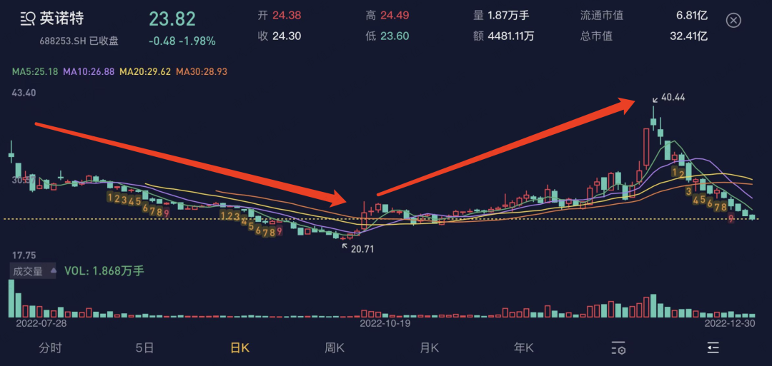 随后疫情管控开始松动,尤其进入12月,取消常规核酸后,市场直接给了有抗原概念的英诺特一个20cm大长腿。