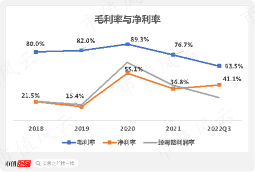 公司盈利能力较为可观,综合毛利率水平很高,2022年前三季度为63.5%,同期净利率也高达41.1%。
